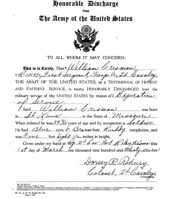 | First Sergeant William Crismon once again qualifies as Expert Rifleman (the saber is no longer considered a side weapon). The family of six take a furlough vacation in a new 1936 Ford to Maynard, Arkansas and visit Grandfather Catt Crismon. A sergeant living on the circle retires, vacating the number two home in location stature. William and Bessie move their family across the circle into the upper status home. These are idyllic times in the US Cavalry, almost isolated from the depression related problems of the country at that time. It has been many years since World War I. No threat to the USA is apparent. While the Post gets a new Commanding Officer every two years or so, the enlisted ranks are stable. However, new weapons and mechanized machinery are becoming available. Why, Fort Riley even has an Army Air Corps field. Prominent buildings on the Post have direction instructions painted on the roofs for the airmen. Unprecedented, an almost blind horse is allowed to roam about the Post as it wishes. “Keno” is wonderful with children. A favorite Bessie’s Kodak Box Brownie photo of JoAnn, Bill, Bob, and Mary astride Keno (as usual, eating grass) is priceless. When Keno wishes to get rid himself of the Army Brats, he slowly walks under a low hanging tree branch and the giggling children gently fall off the rear of the horse. |